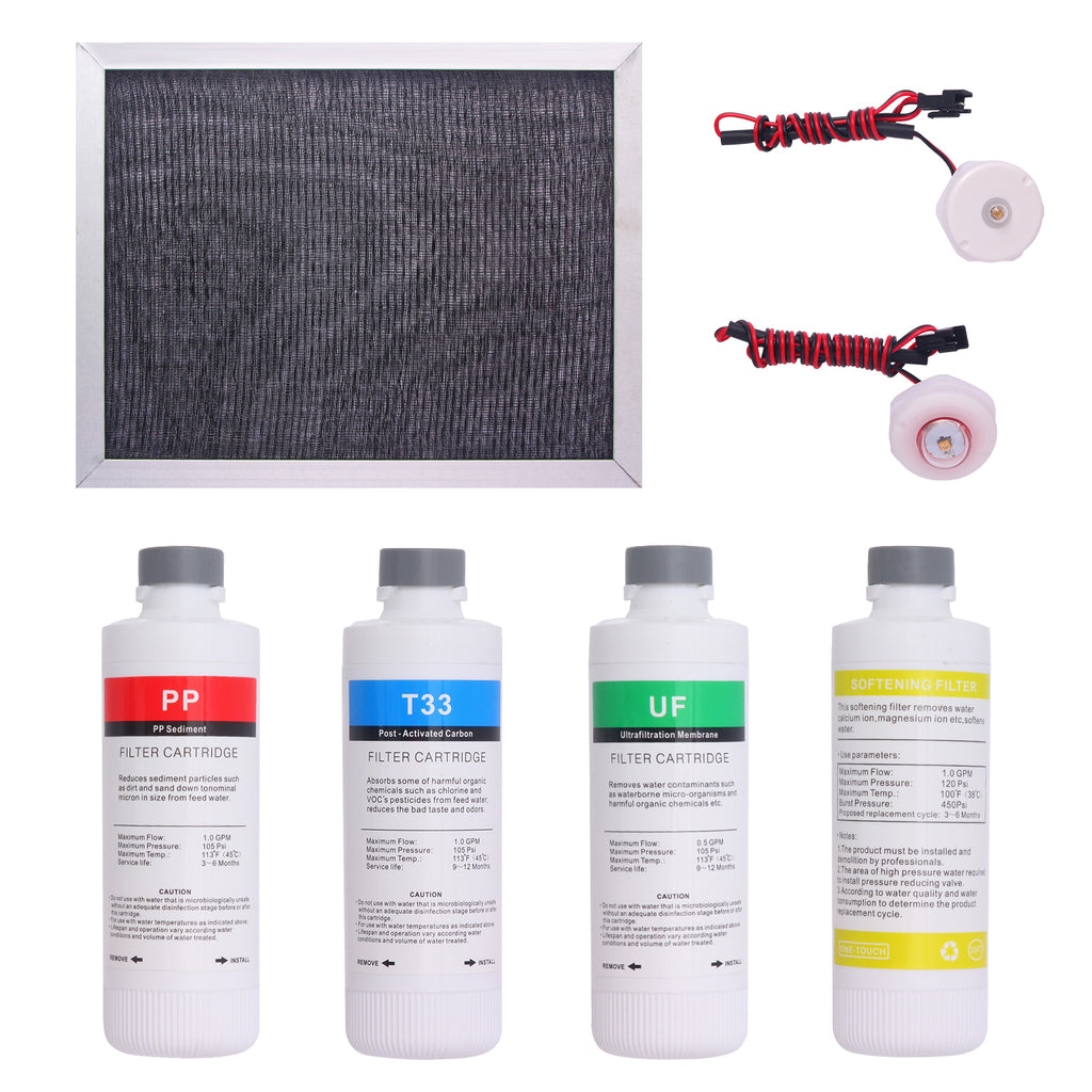 The package contains:Softening Filter + Ultrafiltration Membrane Filter + PP Sediment Filter + Post-Activated Carbon + Filter Mesh + 2*UV Light.